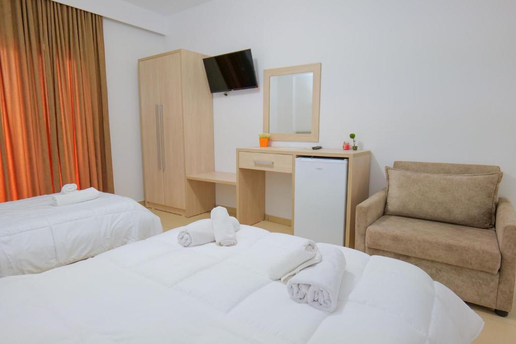 "Indulge in comfort with 1 bunk bed and 1 large double bed in our Quadruple Room with Balcony. Unwind in serene surroundings and enjoy restful sleep on comfy beds. This room features modern amenities, a private bathroom, and air conditioning for your comfort. Watch your favorite shows on the flat-screen TV."